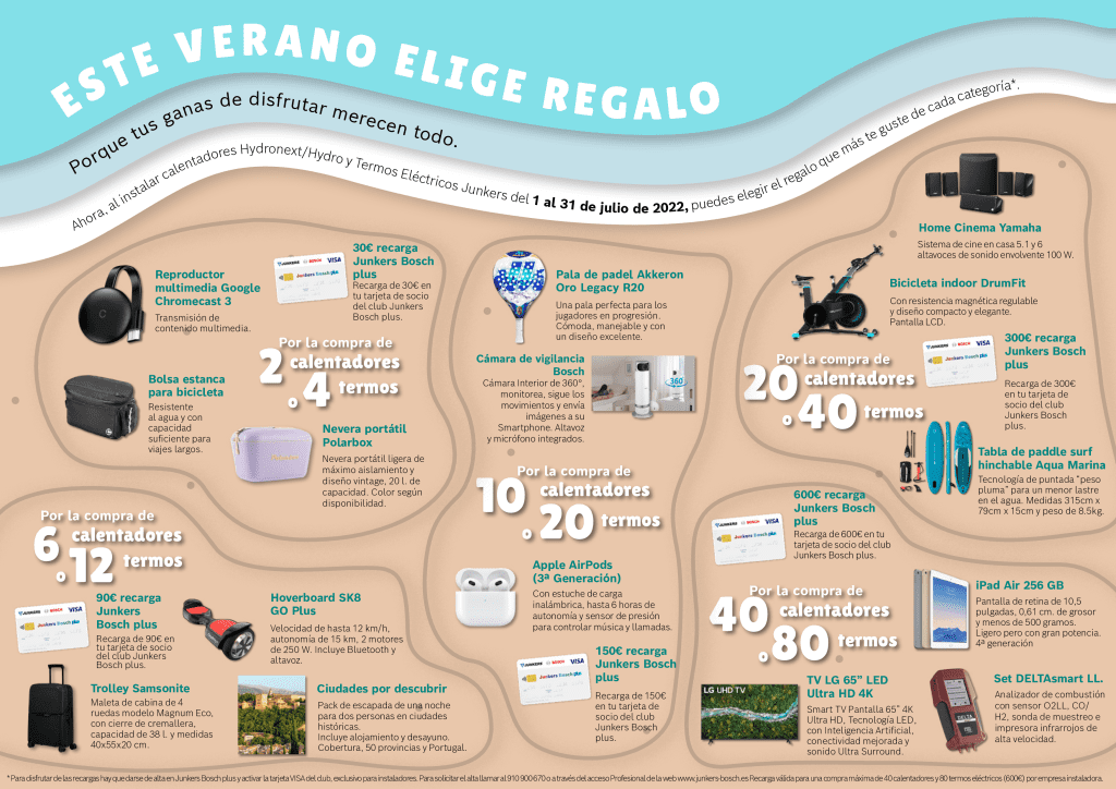 Junkers ha lanzado para este verano una nueva promoción dirigida al instalador, válida desde el 1 de julio hasta el 31 de julio de 2022 y solo por la compra de calentadores de la gama Hidronext, calentadores Hydro y Termos eléctricos Elacell.