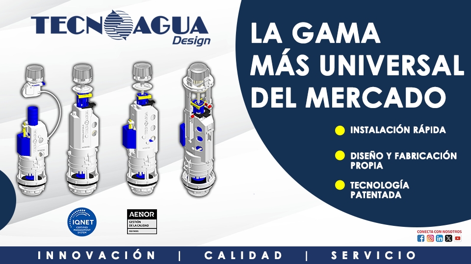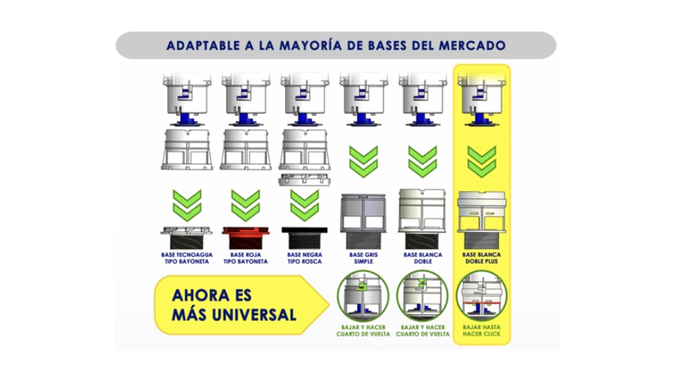 Los Mecanismos de descargas de cisternas de TECNOAGUA, gracias a la innovación, son 100% universales a la gran mayoría de bases del mercado, incluso para la nueva base doble plus.